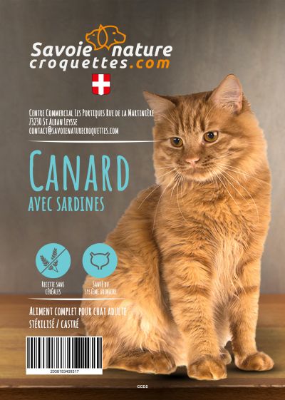 Aliment complet au Canard & Sardines pour chat adulte toute race.